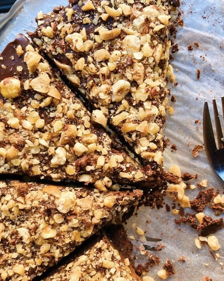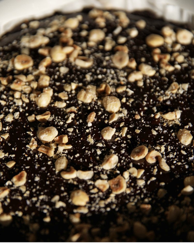 Pour the filling into the pie crust. It will look like a wet chocolate sauce. Sprinkle on crushed hazelnuts and a pinch of flaky salt. ( I always place the pie plate on a sheet pan before it goes in the fridge because it’s very jiggly and wet at this stage, and it is much easier to manoeuvre a cool sheet pan than a piping hot pie plate. I also put down a trivet or something for the sheet pan to rest on in the fridge so the heat isn’t sitting directly on the surface. )